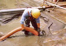強力吸引で、汚泥の大量吸引・河川の浚渫作業・水門の沈砂回収・浄水場の沈砂回収・各種ピットの汚泥回収等の作業をおこないます。